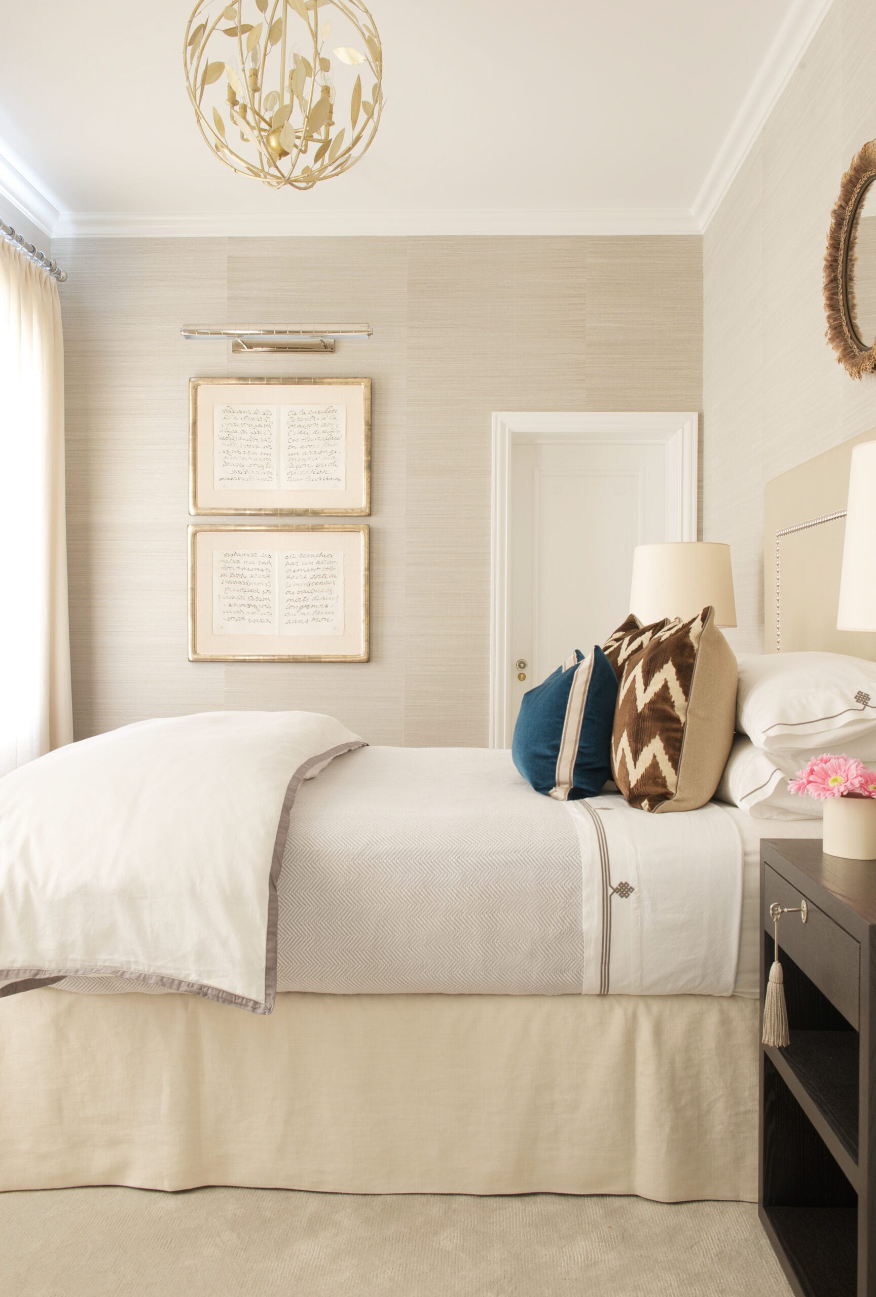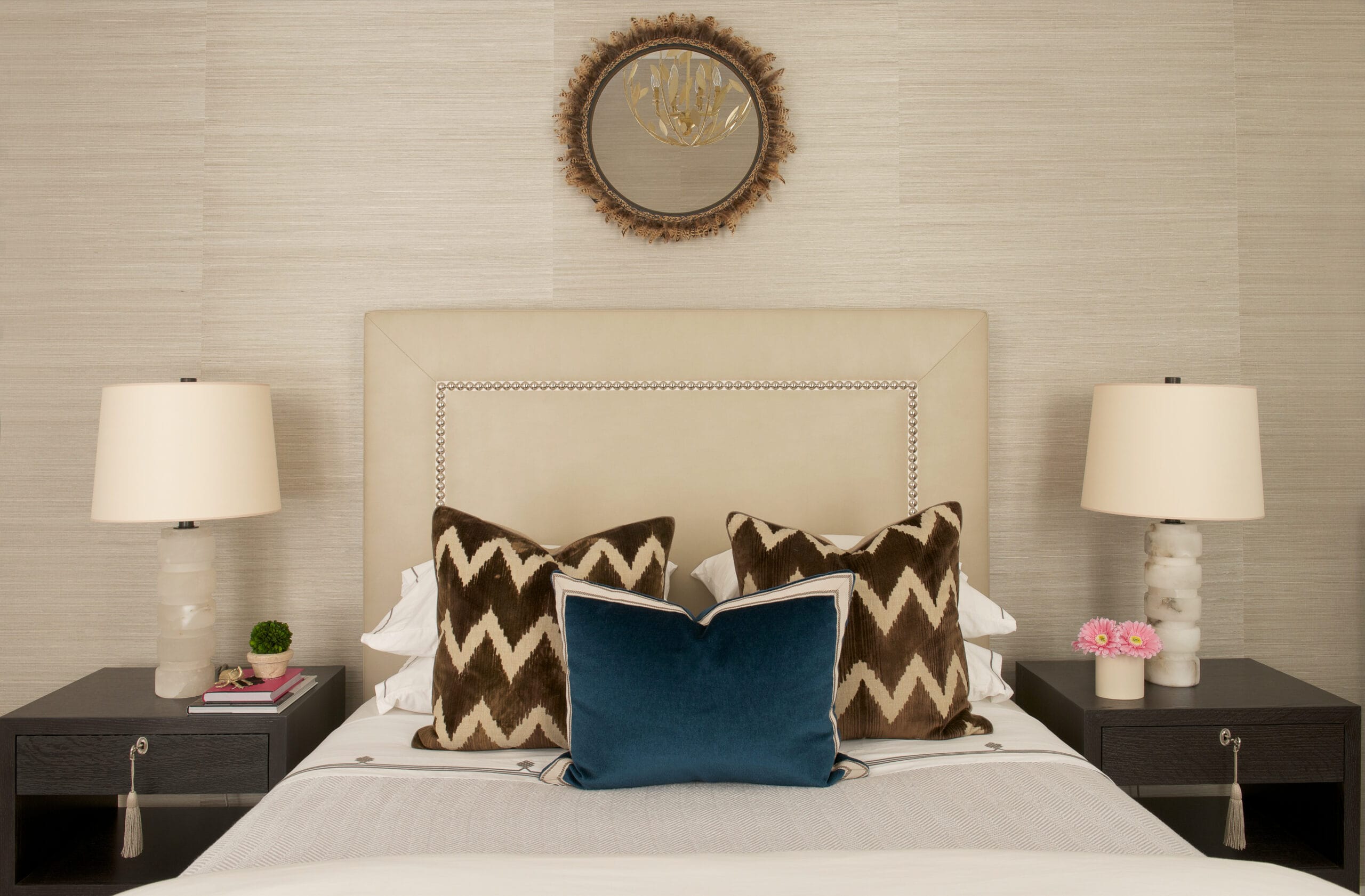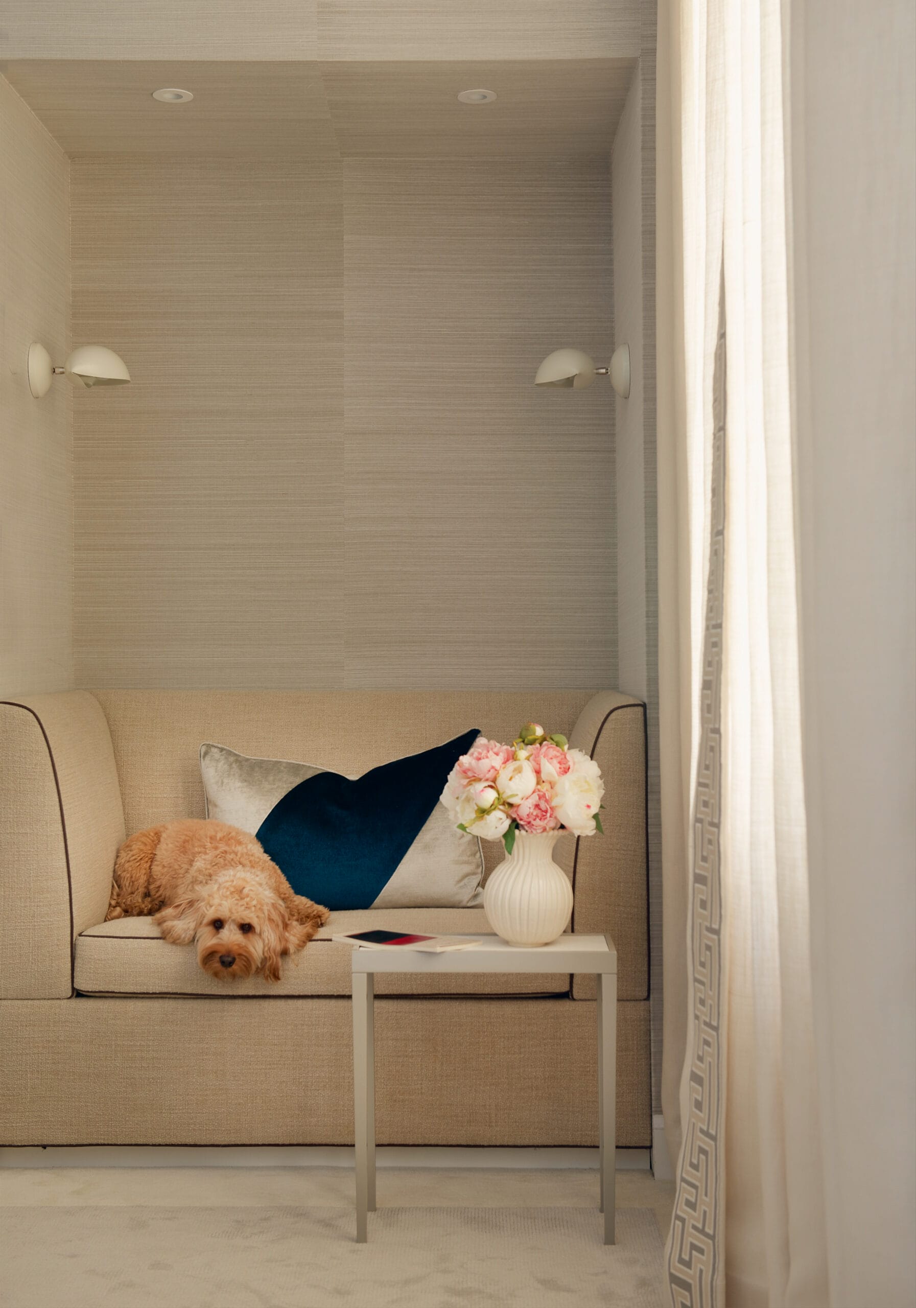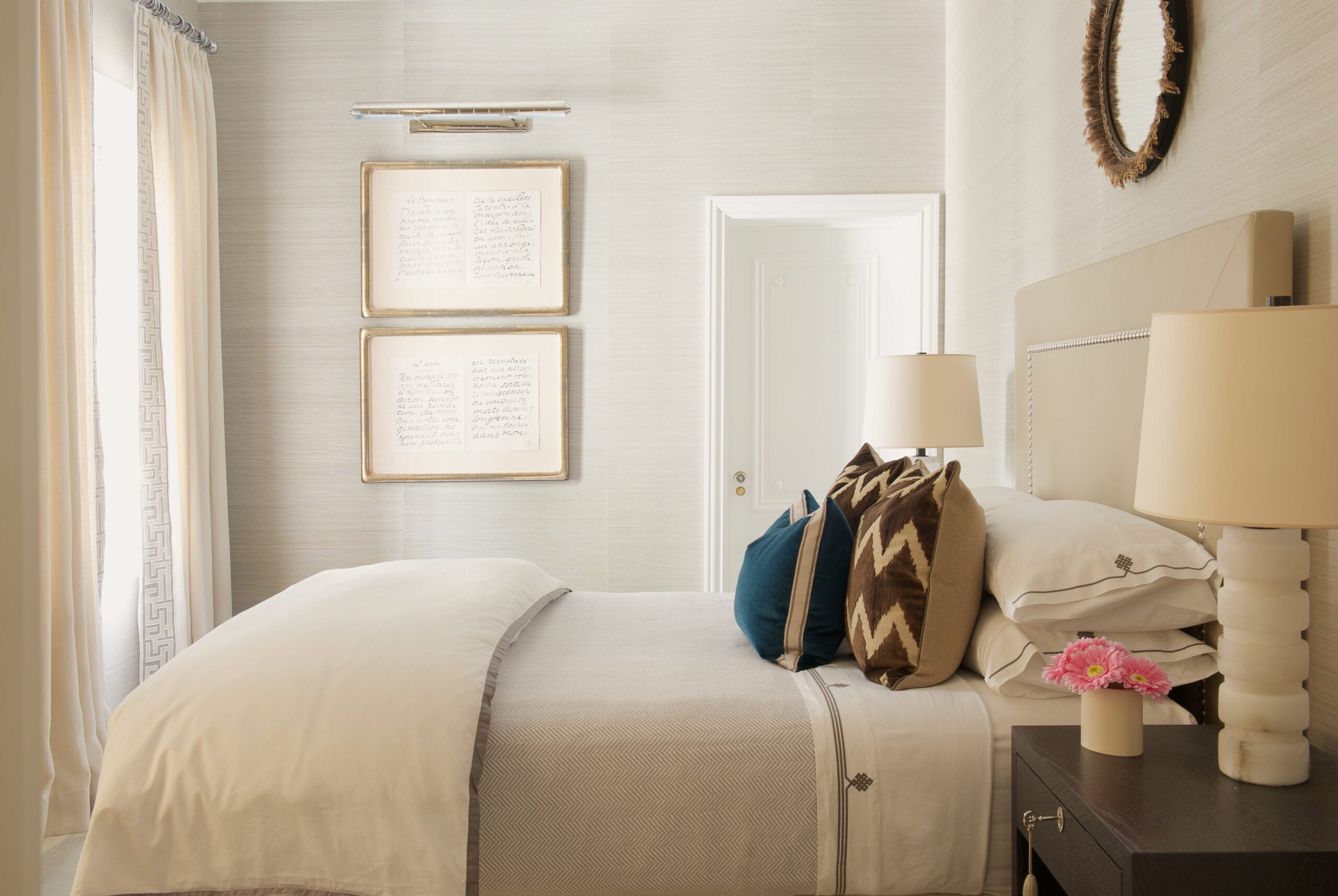 The interior design creates a tranquil and inviting space through the use of Phillip Jeffries grasscloth wall coverings and sumptuous fabrics on furniture and windows.