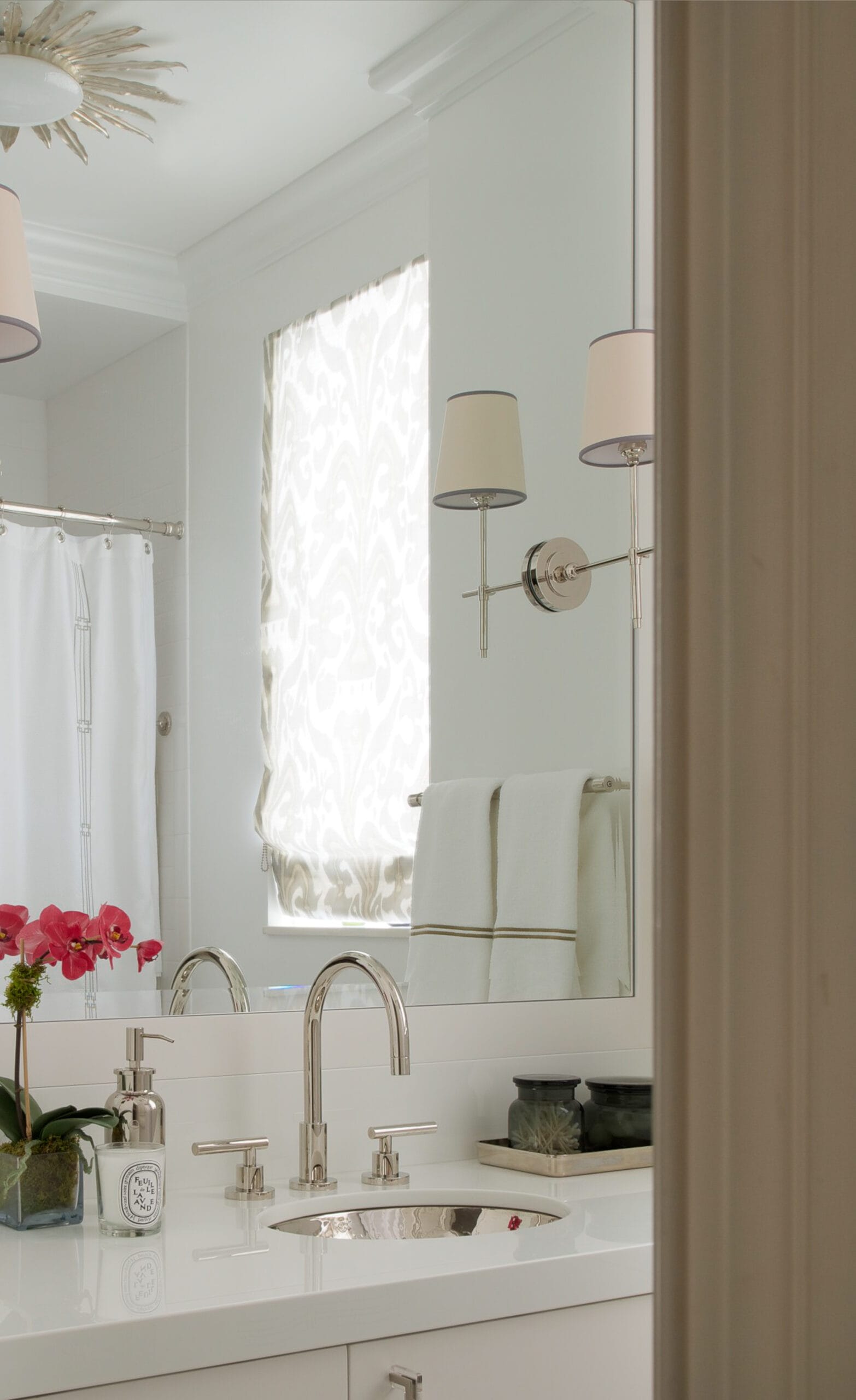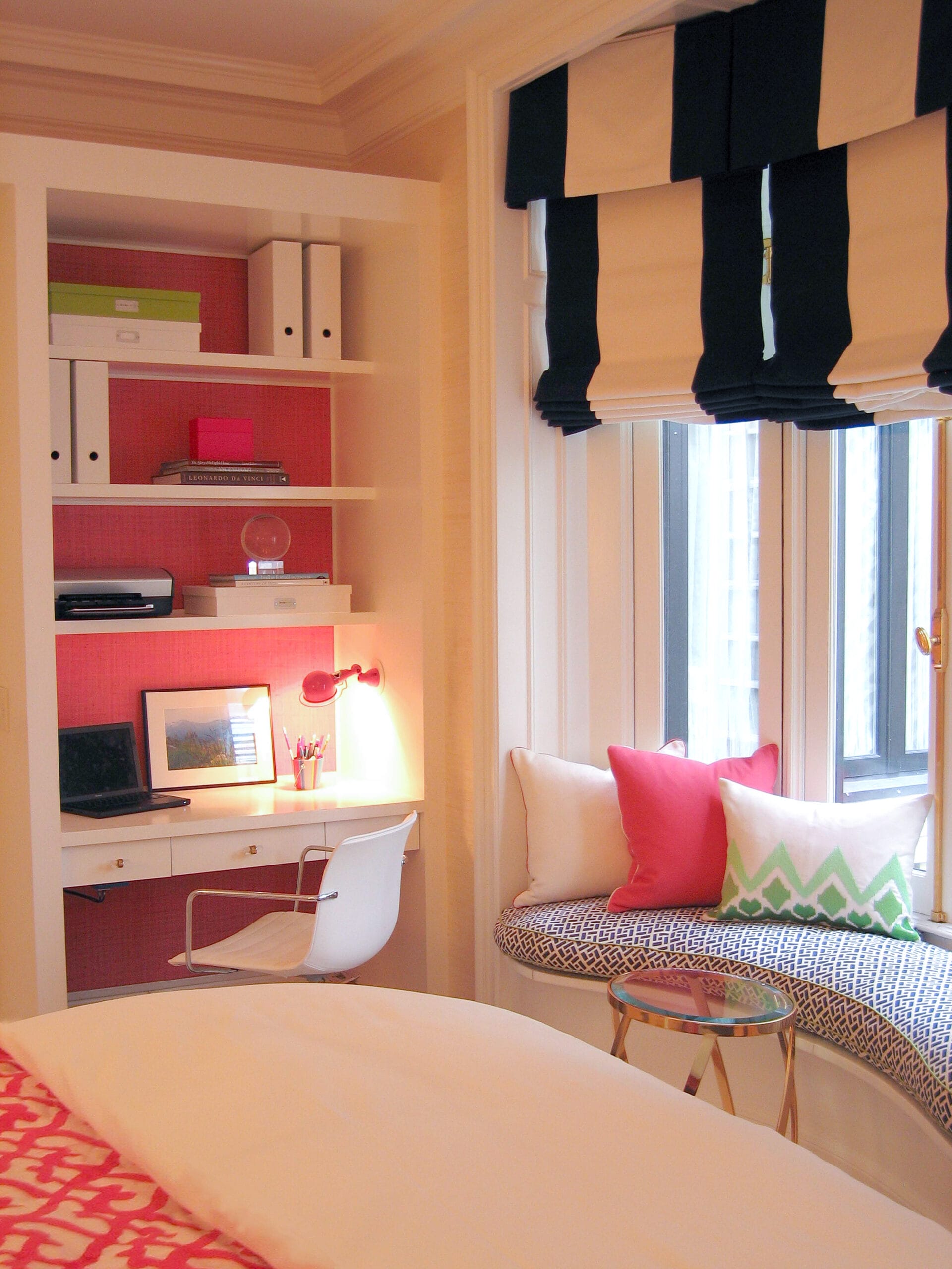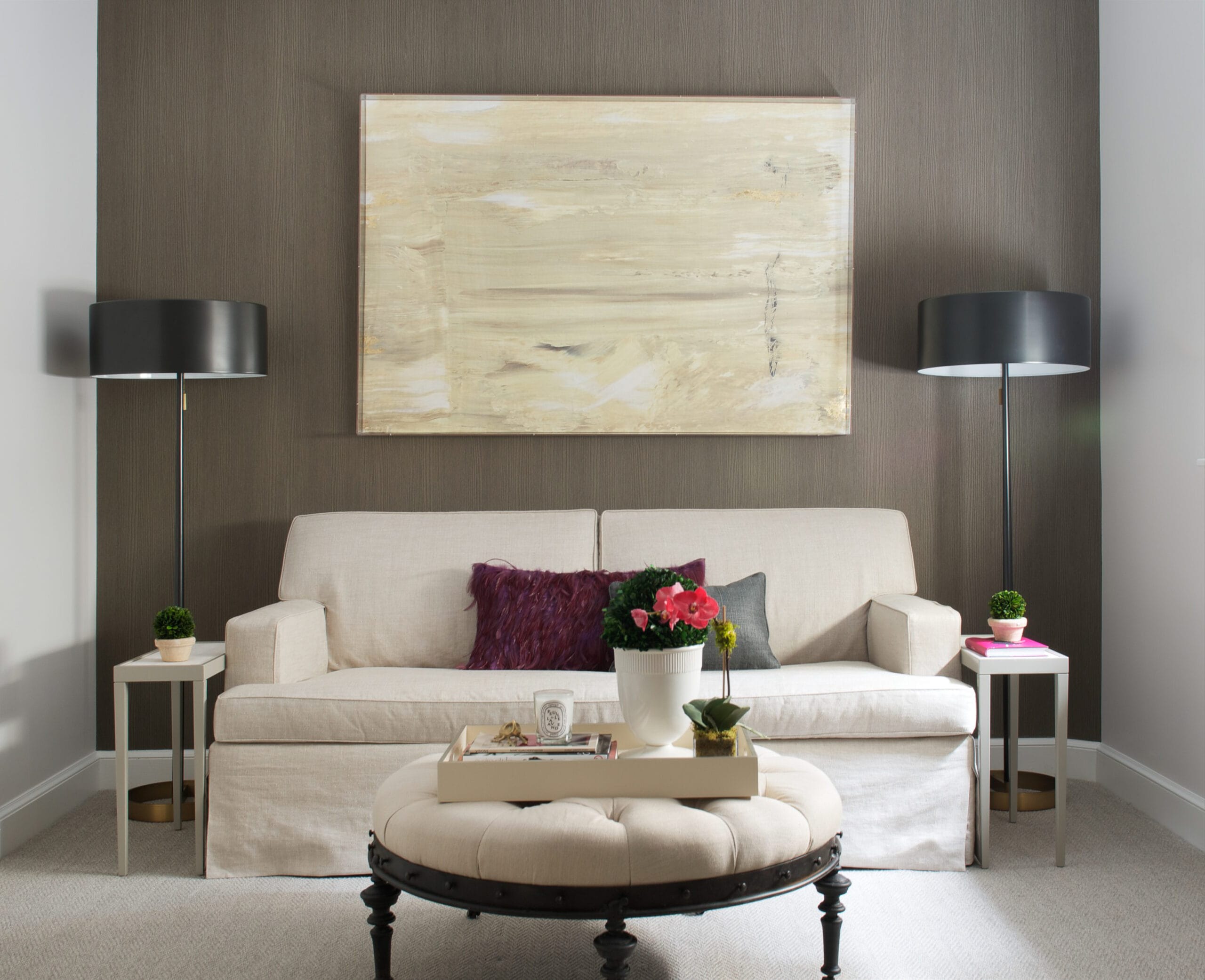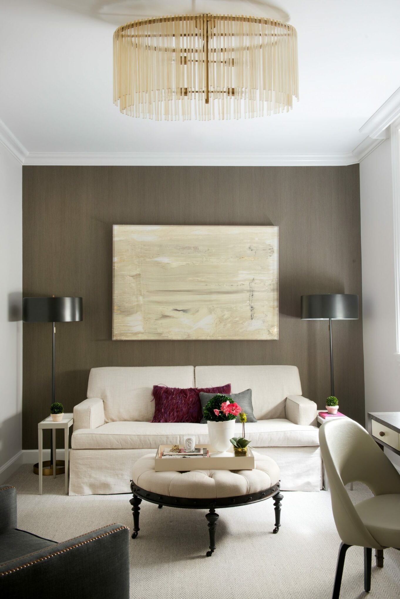 The interior design creates a tranquil and inviting space through the use of Phillip Jeffries grasscloth wall coverings and sumptuous fabrics on furniture and windows.